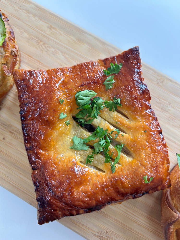 A secret creation of pork sausage meat with apricots, seasonings and caramelized onions. Glazed with an apple jam and sesame seeds.